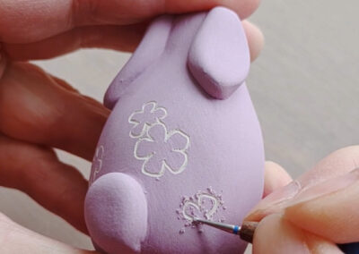C’est à l’occasion d’un stage à l’atelier céramique « La poterie d’Autrans » de Florian Culis et Anaïs Michalinoff que j’ai été sérieusement en contact avec la terre et j’ai découvert le travail de la céramique. Suite à ce stage qui a été une vraie révélation, j’ai décidé de suivre leur formation professionnelle. Après plusieurs mois de formation et de travail personnel intensif, particulièrement au tour, j’ai décidé de créer mon atelier de céramiste « Victoria Céramique » à Voiron (Isère – France) et de créer mon entreprise. J’explore plusieurs pistes de création : modelage, tournage, travail à la plaque, estampage… En modelage, mon sujet de prédilection est lapinesque ! J’aime modeler des lapins, de toutes tailles, les engober et leur dessiner de délicates petites feuilles. Je travaille la faïence blanche et rouge, mais aussi le grès. Pour cette dernière terre, je crée mes propres émaux haute température (1260°C). Tourner est également une grande source de plaisir et d’apaisement. Les formes en boule, les bols… sont mes favoris, mais j’aime également beaucoup réaliser des tasses et des vases. J’aime aussi réaliser ma petite théière fétiche, mais elle prend beaucoup de temps et parfois, souvent, trop souvent, il faut choisir !