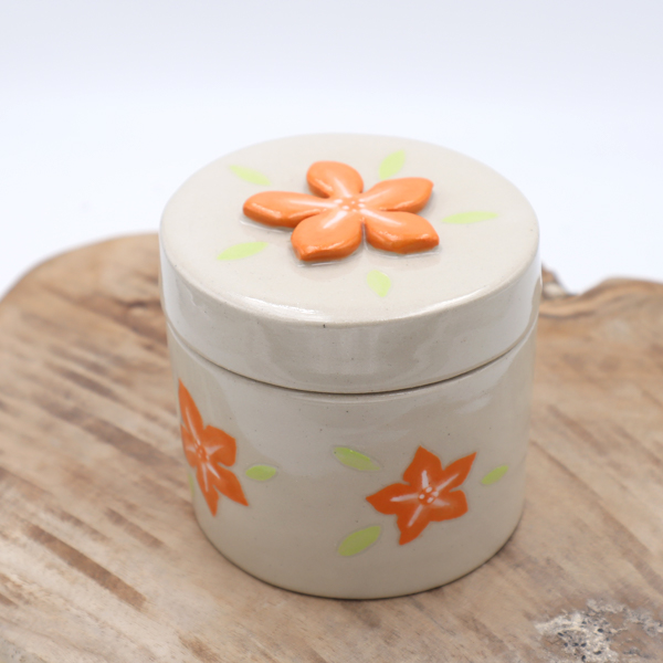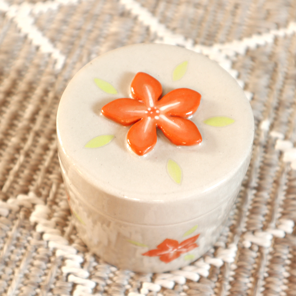Boîte en grés fleuri. Cette boite a été cuite une première fois à 980°c puis à 1260°c pour son émaillage.