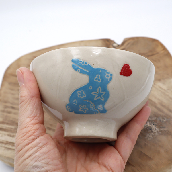 Ce bol est en grès, cuit à haute température. Le bol a été modelé à la main. Le Bunny a été dessiné à l’engobe et sgraffité à la main.