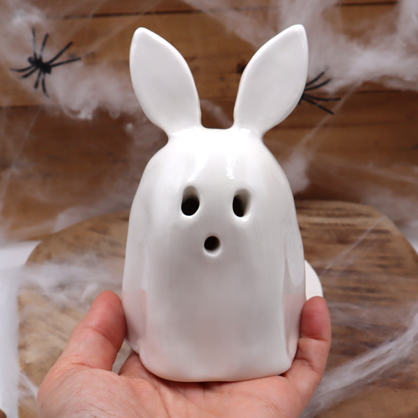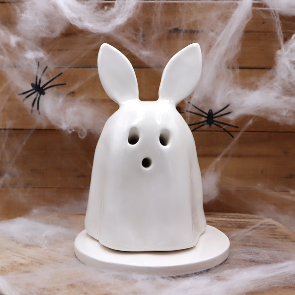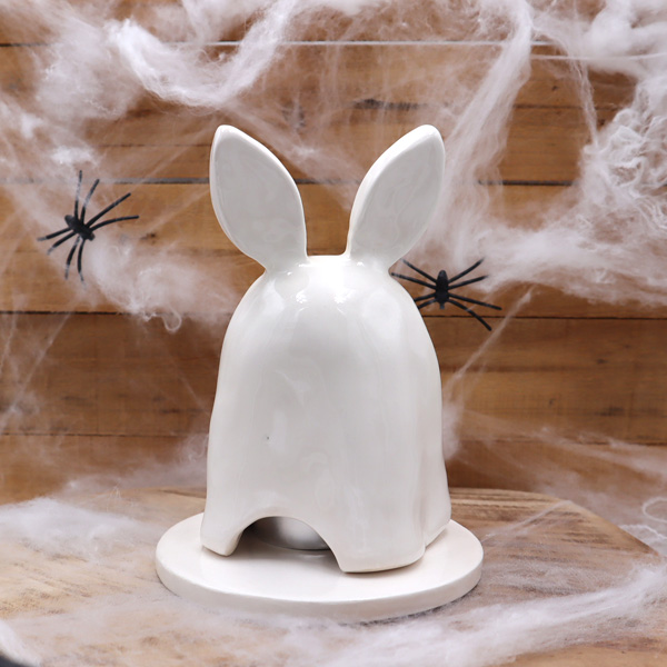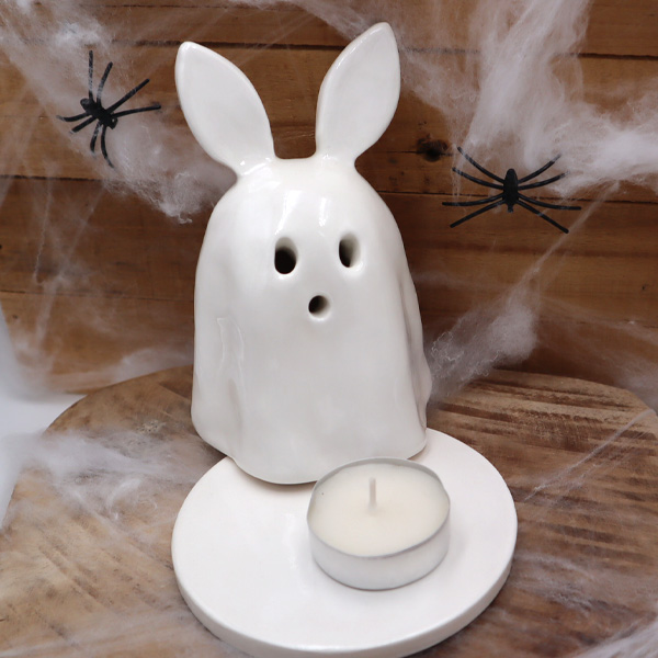 Lapin fantôme de 9 cm environ (12 cm avec les oreilles) en faïence, modelé et engobé à la main. Il a été cuit une première fois à 1000°c, puis émaillé et cuit de nouveau à 1000°c. Il est vendu avec un support pour la bougie chauffe-plat.