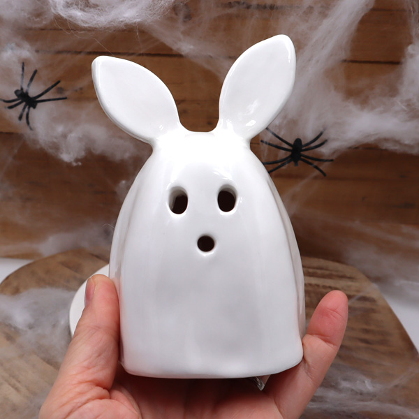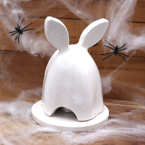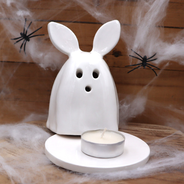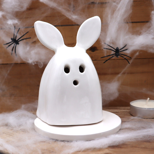 Lapin fantôme de 9 cm environ (12 cm avec les oreilles) en faïence, modelé et engobé à la main. Il a été cuit une première fois à 1000°c, puis émaillé et cuit de nouveau à 1000°c. Il est vendu avec un support pour la bougie chauffe-plat.