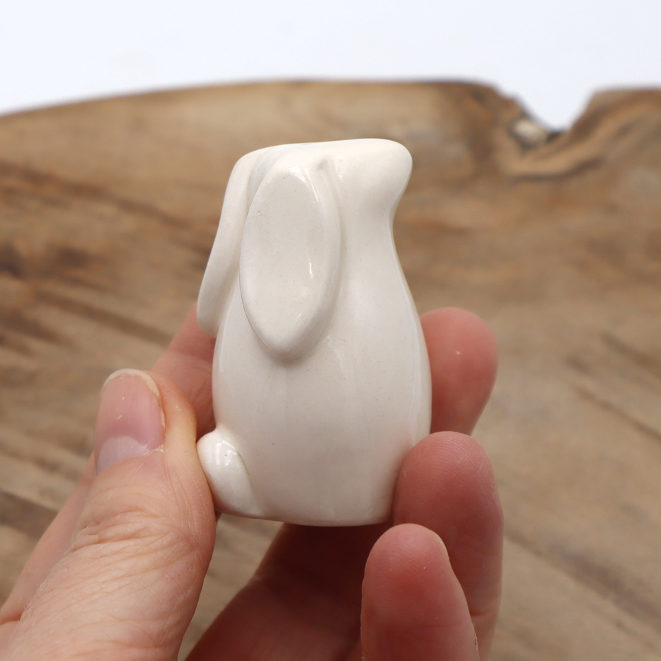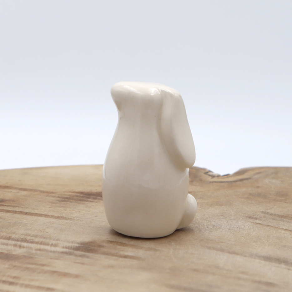 Choupi Bunny de 5 cm de haut environ en faïence. Il est façonné, décoré à la main et émaillé. Il a subi une première cuisson à 1020°C, puis une seconde cuisson à 980°C pour son émaillage.