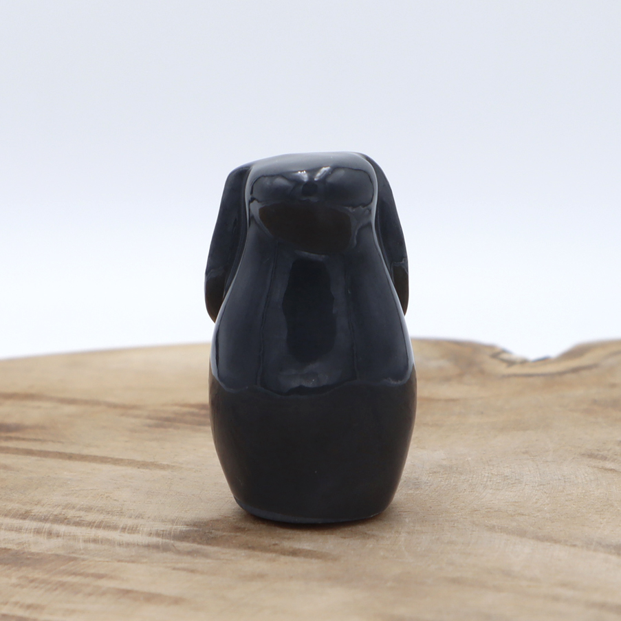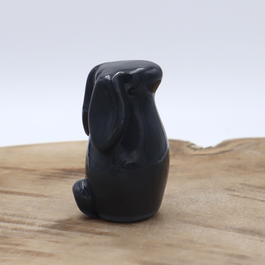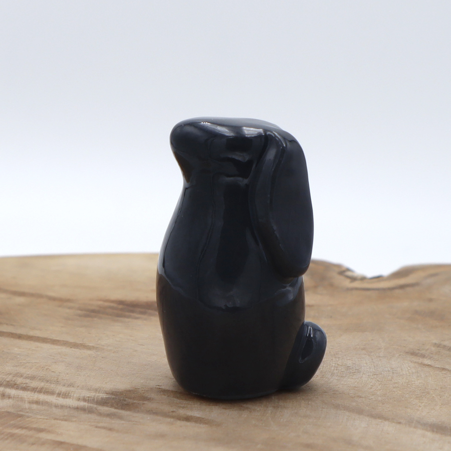 Choupi Bunny de 5 cm de haut environ en faïence. Il est façonné, décoré à la main et émaillé. Il a subi une première cuisson à 1020°C, puis une seconde cuisson à 980°C pour son émaillage.
