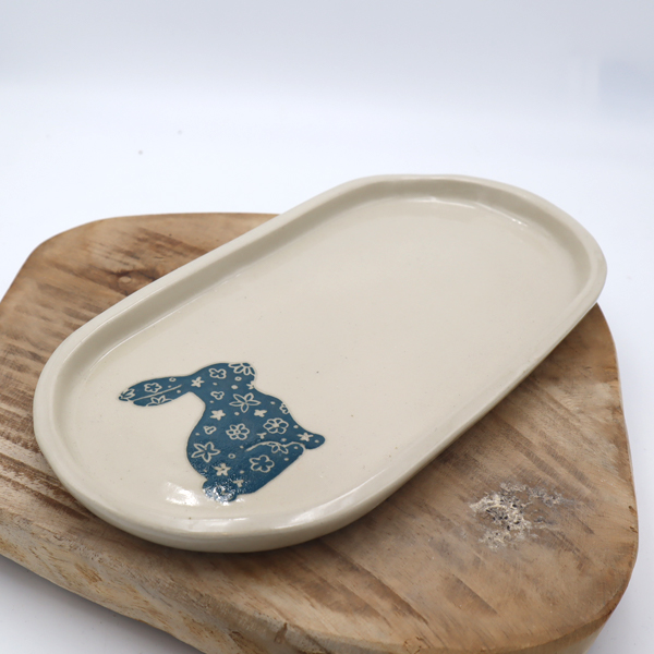 Plateau en grès réalisé par estampage. Le Bunny a été dessiné à l’engobe à la main.
