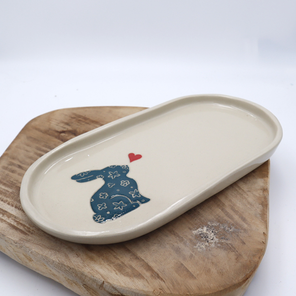 Plateau en grès réalisé par estampage. Le Bunny a été dessiné à l’engobe à la main.