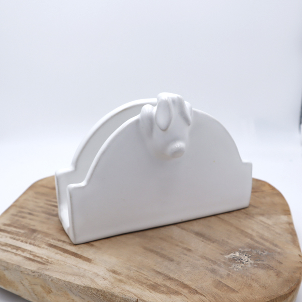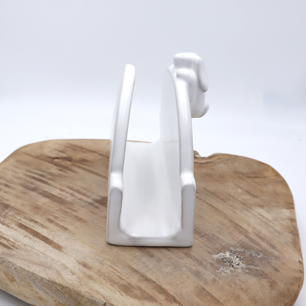 Porte-éponge ou dépose-courrier avec un lapin décoratif, créé en grès et émaillé de blanc. Il a été cuit une première fois à 980°c, puis émaillé et cuit de nouveau à 1260°c.