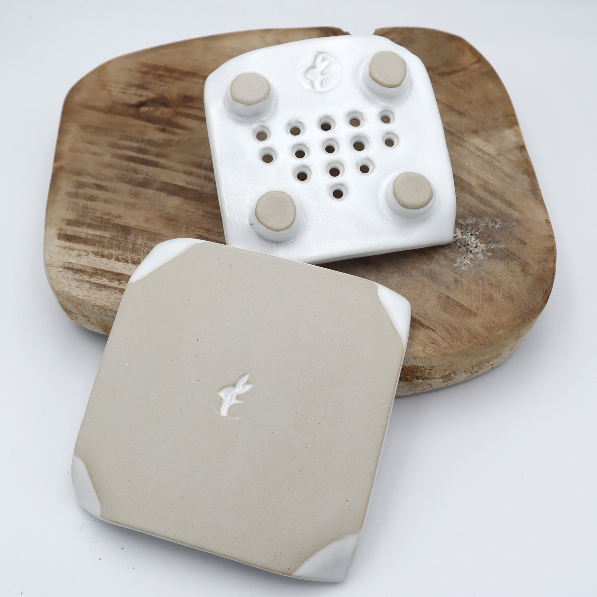 Porte-savon en grès avec un petit lapin décoratif émaillé en blanc mat. Il a été cuit une première fois à 980°c, puis émaillé et cuit de nouveau à 1260°c.