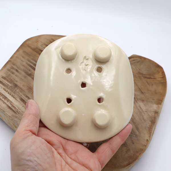 Modelé à la main, ce porte savon est en grès, cuit à haute température, dessins à la main. Ce porte savon fait partie de tests réalisés pendant l’année 2025.