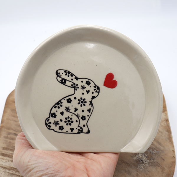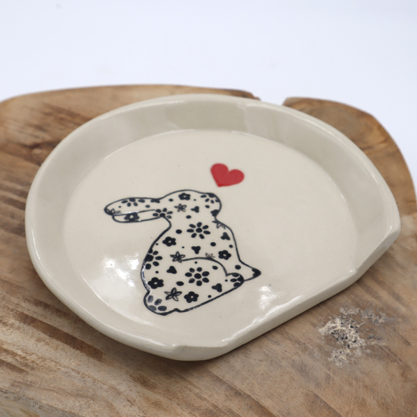 Ce repose cuillère est en grès, cuit à haute température. Il a été réalisé par estampage. Le Bunny est dessiné à l’engobe et sgraffité à la main.