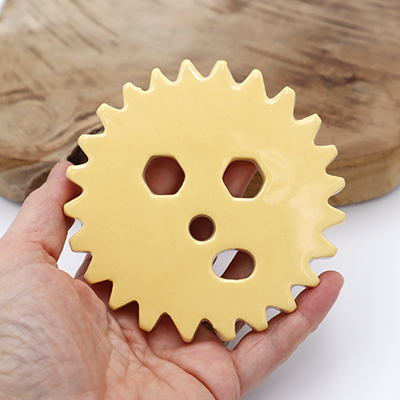Séparateur de fleurs en faïence de 10 cm de diamètre environ et 0,5 cm d’épaisseur environ. Il est façonné à la main et engobé à la main. Il a subi 1 cuisson à 1020°C, puis une autre à 980°c