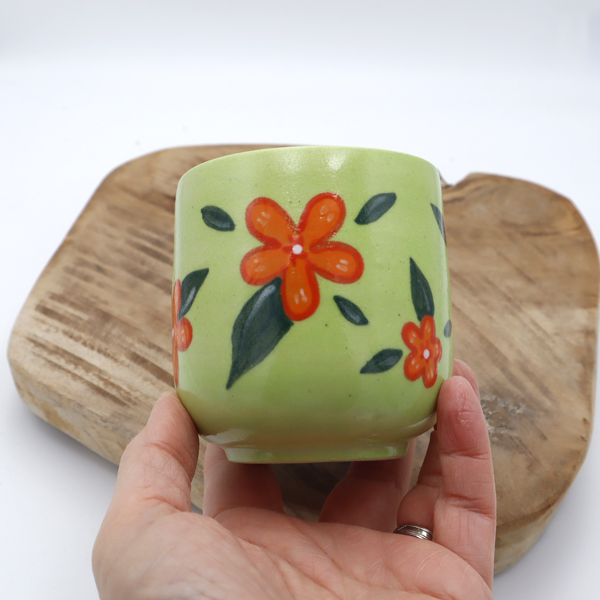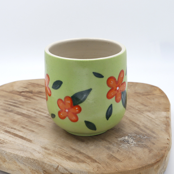 L’extérieur de la tasse est un peu rugueux, lié à l’engobe vert utilisé.