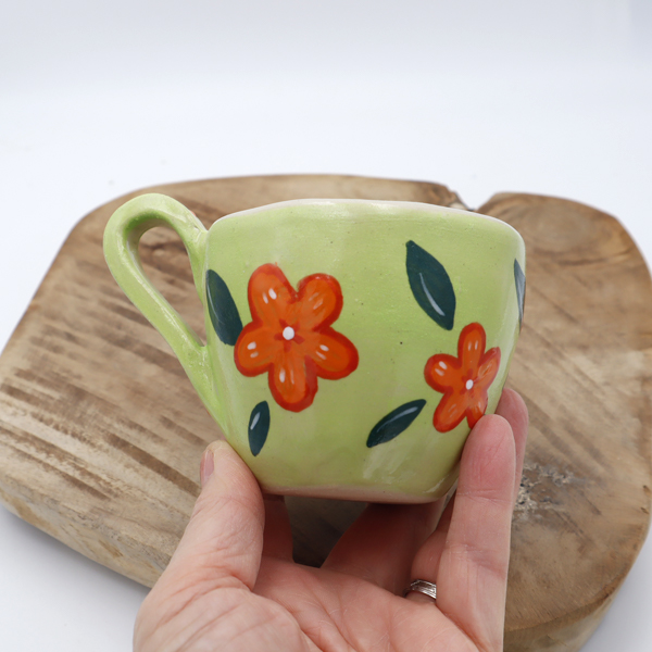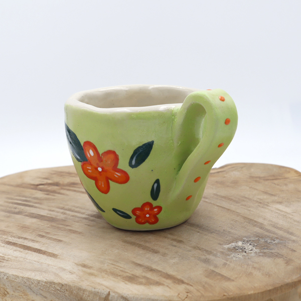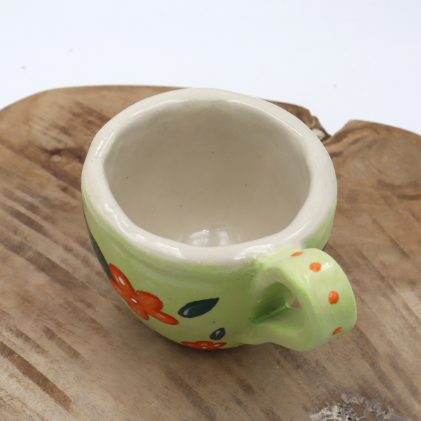 Le bord de la tasse est épais (voir photo) et la partie verte est un peu rugueuse, ce qui est dû à l’engobe vert utilisé.