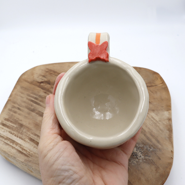 Tournée, cette tasse est en grès, cuit à haute température, dessins à la main. Cette tasse fait partie de tests réalisés pendant l’année 2025.