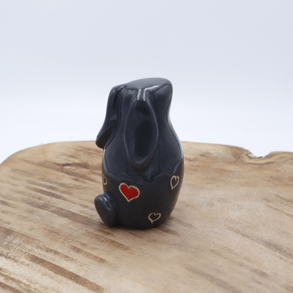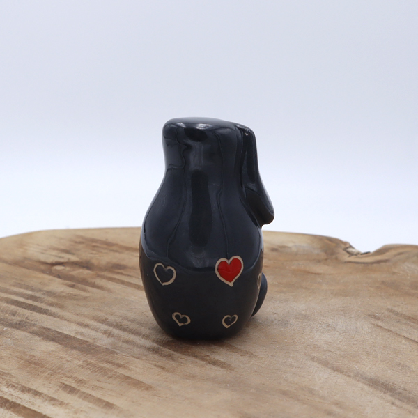 Tiny Bunny de 6 cm de haut en faïence. Il est façonné, décoré à la main et émaillé. Il a subi une première cuisson à 1020°C, puis une seconde cuisson à 980°C pour son émaillage.