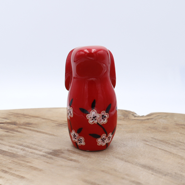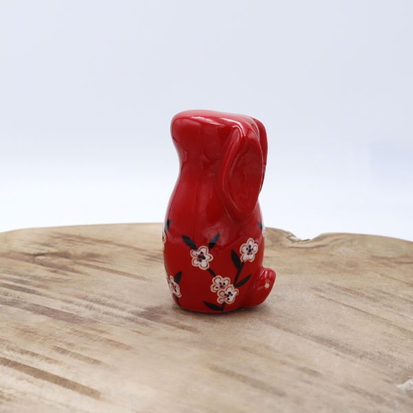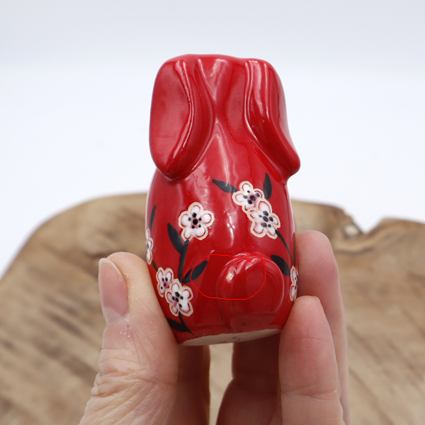Lapin en céramique de 6 cm de haut et 3 cm de large environ. En faïence, il est façonné et peint à la main. Sa décoration au pinceau en fait une pièce unique. Il a été cuit deux fois, une première fois à 1020°c et une seconde fois à 980°c pour l’émaillage.